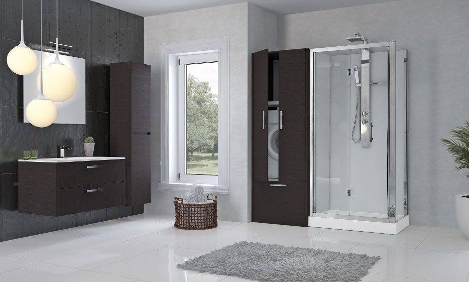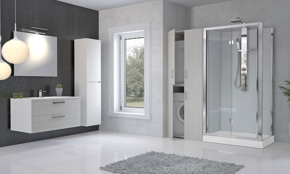 Revolution, entwickelt vom Designer Marco Pellici, nimmt verschiedene Elemente in sich auf, mit denen sich der gesamte Platz der Wanne nutzen lässt: Möbel in verschiedenen Formen und Ausfertigungen, Platz für Waschmaschine und den Trockner, Körbe für die Schmutzwäsche oder Konsolen für Handtücher.