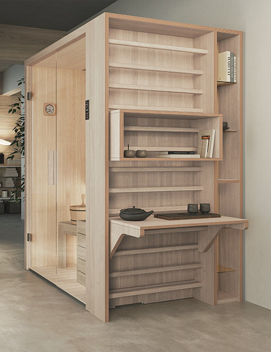 Fun Sauna bietet eine große Auswahl an Modularität und passt sich verschiedenen Räumen und Bedürfnissen an. Mit ihrem klassischen, aber raffinierten Stil fügt sie sich perfekt auch in Apartments ein und kombiniert Eleganz und Funktionalität für ein Wellness-Erlebnis ohne Kompromisse.